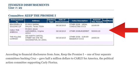To make matters worse, Mercer, the hedge fund magnate and owner of Cambridge Analytica, is also Cruz's main benefactor that bankrolled his Make The Promise I Super PAC. But there is a little quirk in that slippery slope. Last June, Keep the Promise I Super PAC (the same PAC bankrolled by Robert Mercer of Cambridge Analytica) gave Republican presidential candidate Carly Fiorina a half million bucks. So the big question here is why would Ted Cruz give an opponent running for the White House $500,000? [Source]