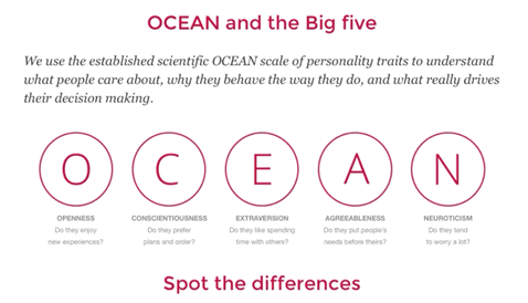Cambridge Analytica brags that they can predict your future behavior of voters by analyzing 5 big personality traits they called OCEAN. They have devised a plotted description attached to a numerical assessment that targets individual voters, based on a “psychographic score” of your presumed personality traits.