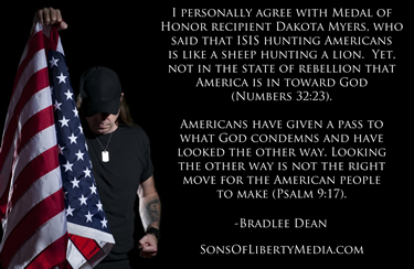 As a side note, at this point this would suicide mission for these jihadists, for they know that behind every blade of grass in this country is an armed citizen. I personally agree with Medal of Honor recipient Dakota Myers, who said that ISIS hunting Americans is like a sheep hunting a lion. Yet, not in the state of rebellion that America is in toward God (Numbers 32:23).