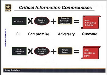 The PowerPoint presentation warns against “Critical Information Compromises” involving material such as the “itineraries of … senior executive service (SES)” and “very important persons (VIPs),” any of which can result in “Attack, Kidnapping, Publicity.”