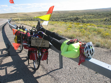 As I looked back at some of our bicycle touring on the Continental Divide this past summer, I have to pinch myself at being this old and yet able to pedal my touring cycle for thousands of miles. Perhaps the picture of me snoozing on a guard rail with the sign saying, “Continental Divide Ride 2011 with Tim, Bob and Frosty” says it all. Did I really see an 800 pound grizzly take down a cow elk in Yellowstone National Park and feast on his lunch for two hours? Did I meet my old college roommate John and talk for seven hours to catch up. From a teacher, he’s become a top novelist who has met and befriended Stephen King. His books enthrall! Is the power of the Internet (created by Al Gore, of course) simply amazing for connecting us worldwide? Was that night where were we slept in a teepee on the plains or rode a jackalope in DeBois, Wyoming a lot of fun or what? How about that young couple riding 24,000 miles around the world on bicycles that we met in Ludden, Wyoming? I check them out to see their progress at www.foodcyclist.com John and Kate put on quite a show with their video camera and writing. Many blessings on your journey my friends.