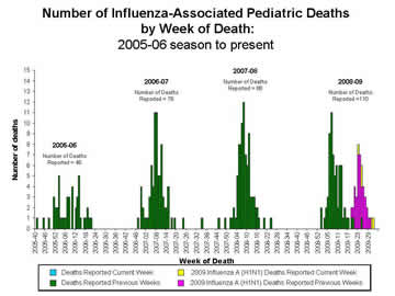 While every childhood flu-related death should be considered tragic, and the number of flu-related pediatric deaths in 2009 is greater than prior flu seasons as a percentage, in real numbers it is not a significant increase. See chart below: