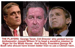 Let's face it. George W. Bush's political problems over the CIA "operative leak" is a problem of his own making. If Bush had not decided to be the "inclusive, nonpartisan president" when he assumed the mantle of the presidency of the United States, he wouldn't be in hot water right now. Bush seriously erred when he decided to retain several Bill Clinton department heads. George Tenet, the Director of the Central Intelligence Agency was one of those carryovers. If Tenet was not at the helm of the CIA in July, 2002 when the CIA was attempting to verify the accuracy of a British MI-5 report that Iraq had attempted to purchase uranium yellowcake (enriched uranium) from Niger, then a former Bill Clinton National Security Agency official would likely not have been sent to probe the Nigerian government to determine whether or not the story was true. Joseph Wilson IV was a former Bush-41 diplomat in Iraq. Even though Wilson was a major contributor to Al Gore in 2000, Bush-43 would likely not have viewed Tenet's use of Wilson as problematic since Clinton's former NSA official was also Bush-41's acting ambassador to Iraq in 1990 at the time of the Iraqi invasion of Kuwait. Wilson posed for several interviews with the international media wearing a noose around his neck (his message to Saddam Hussein. Wilson said if the Iraqi leader wanted to execute him, he'd bring his own rope to the party). Wilson's gung-ho attitude won over Bush-41...and, if his name was mentioned in private meetings with Tenet in conjunction with the assignment to Niger, it is likely that Wilson's personae would have won over Bush-43 who likes gung-ho diplomacy as much as his daddy. (Unknown to Bush-41 and Bush-43 was the fact that while he was serving as the acting ambassador in Baghdad in 1990 Wilson was reporting his activities not only to Bush-41 Secretary of State James Baker, he was also issuing weekly reports to Senator Al Gore, Jr. of Tennessee.) This would have been problematic to Bush-43 to whom loyalty is the only yardstick used to measure whether or not someone remains on the Bush team. Of course, Wilson--a diehard liberal--was never on the Bush team. Nor for that matter is George Tenet, the CIA's master schemer. For all his Texas upbringing, Bush-43 can't seem to tell the difference between a diamond-back rattler and a garter snake. Bush, trying to prove that he was as nonpartisan as George Washington (who successfully merged his political enemies into his cabinet--and contained them for 8-years), is constantly trying to pick up the diamond-backs. And to no one's surprise, he continues to get bit. One too-many bites from the poisonous snakes who are perpetually coiled to strike anything right of center that moves inside the beltway just might prove fatal for Bush's political career. Our story begins on July 6 of this year when former-Ambassador Wilson chose to go public with his story by identifying himself as the retired diplomat who had been asked by the CIA to go to Niger in 2002 to investigate British reports that Iraq had been trying to buy yellowcake from the Nigerians. Wilson said he had issued a report to the CIA claiming the MI-5 report was incorrect. (The British government, at the urging of the London Times and the Guardian, investigated the same MI-5 report very extensively. After its own investigation, Parliament concluded that the report was genuine.) Wilson's statement in his New York Times op-ed piece appears to be a lie--or the report Wilson issued to the CIA when he returned from his mission in Niger was a lie since his current statement appears to contradict a portion of the report he made to the CIA at the completion of his mission in 2002.